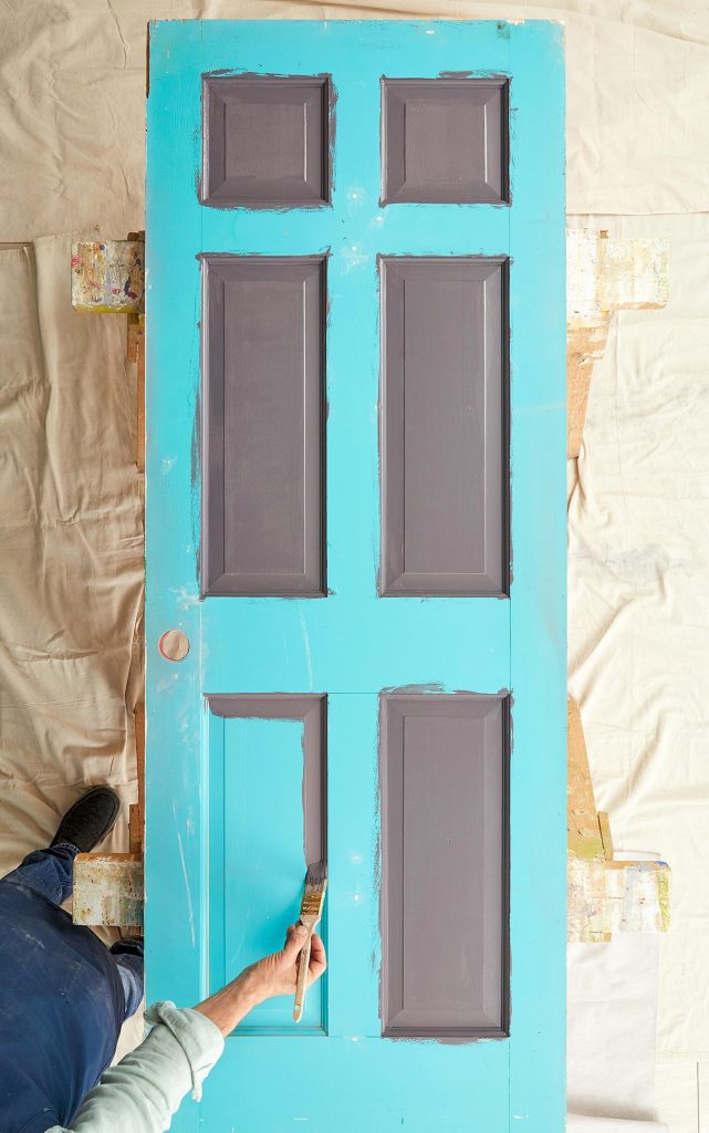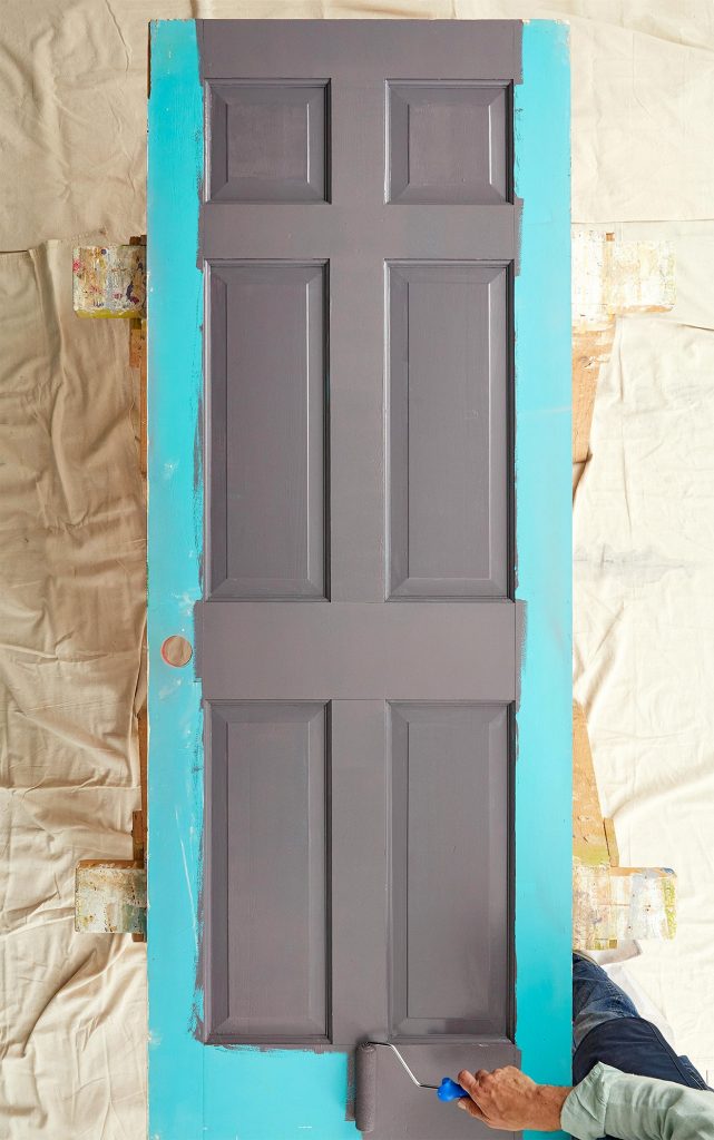 Rollende verf in stijlen tussen afgeschuinde panelen op de deur