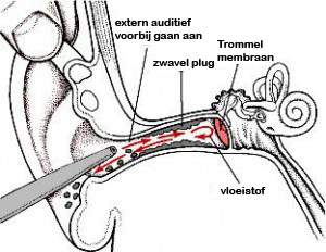 - stof en micro-organismen die vastzitten in de gehoorgang.